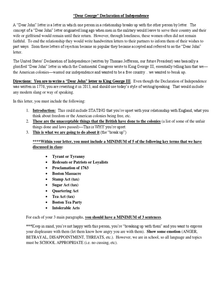 A break-up letter is often referred to as a "Dear John" letter. The Declaration of Independence is in effect a break up letter between the 13 colonies and the British king, George III.Students will write a "Dear George" letter in which they are breaking up with King George. Their letter must contain