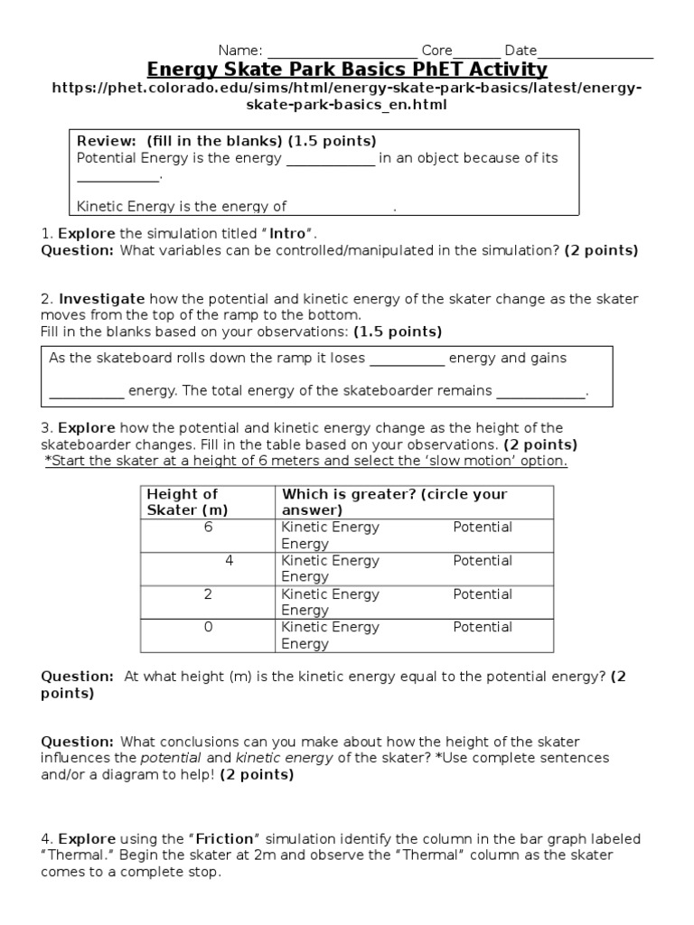 Energy Skate Park Basics Phet Activity Worksheet Answers - Preschool activity worksheets can benefit both educators as well as moms and dads who are trying to enlighten their children the basics of analysis, writing, and also math. These worksheets, produced by experts, can be utilized on a daily basis by your youngster. Phet Energy Skate Park Worksheet Answers It is our objective to make researching & handing down expertise a pleasurable experience for both students and also educators. You as well as your pupils can gain from a range of educational resources, including those centered on mathematics, Grammar skills, science, as well as general understanding. The http://phet.colorado.edu/en/simulation/energy-skate-park-basics Take some time to ... of energy, why the skater will never go higher than your answer to ...