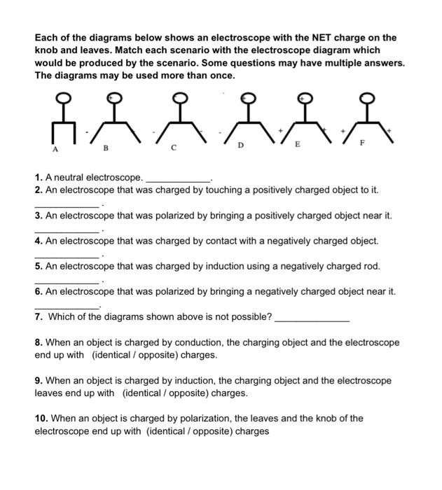 Electroscope Worksheet Each of the diagrams below shows an electroscope with the NET charge on the knob and leaves. Match each scenario with the electroscope diagram which would be produced by the scenario. Some questions may have multiple answers. The diagrams may be used more than once. 1. A neutral electroscope. _____. 2.