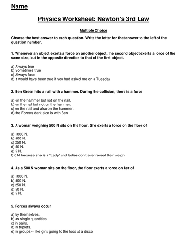 You will be tested on specific examples of the third law of motion in everyday. Newtons Laws Worksheets Show all work on a separate sheet of paper. Every month newtons laws of motion worksheet is an easy fiscal supervisor tool which can be use both electronic or printable or Google Sheets. Identifying Newtons Laws Worksheet 904 Integrated. Newton 3rd Law - Displaying top 8 worksheets found for this concept. Some of the worksheets for this concept are Newtons third law work, Newtons third law, Energy fundamentals lesson plan newtons third law, Newtons laws work, Newtons laws practice problems, 3 newtons third law of motion, Newtons laws of motion, Newtons laws of motion work. Newton's Laws of Motion Worksheets (MCQ) - 3 sets with answer. Newton's First Law - MCQ Worksheet (with answer) Newton's first law of motion states that an object's motion will not change unless a. the net force acting on it is greater than zero. b. a force continues to be applied to the object. c. Where To Download Newtons 3rd Law Answer Key Nobel laureate Steven Weinberg has written that "all that has happened since 1687 is a gloss on the Principia."