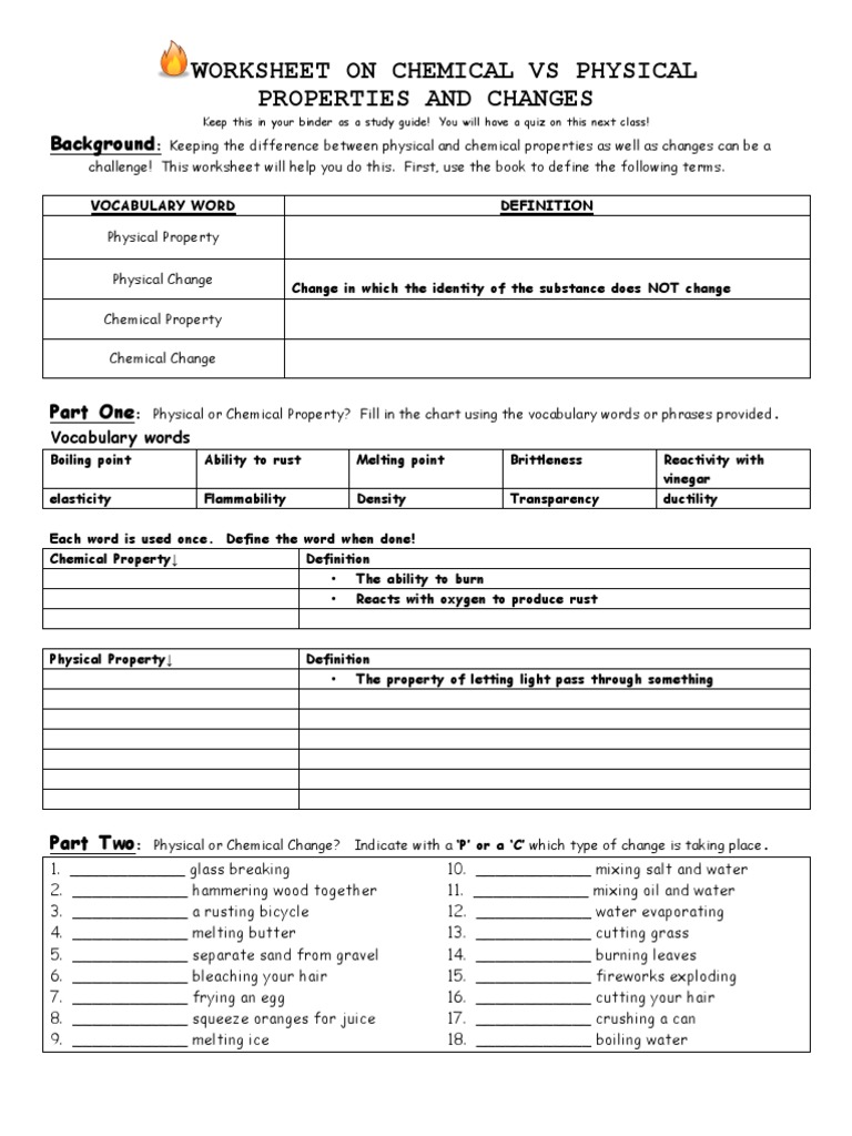 Physical vs chemical changes worksheet