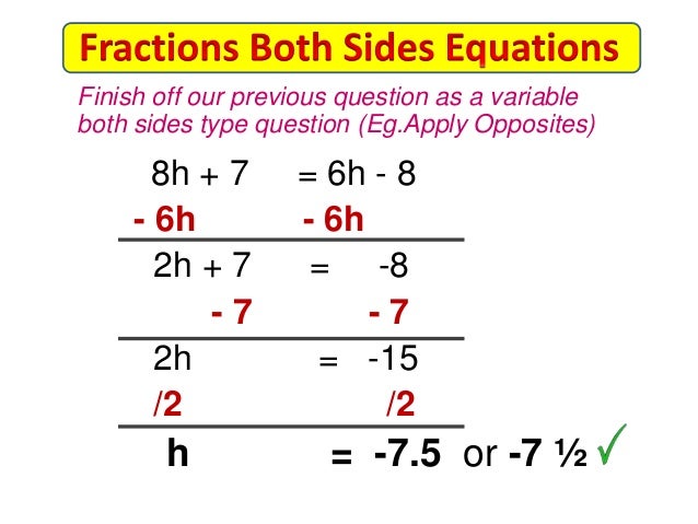Solving equations with variables on both sides with fractions worksheet. Worksheet on Combining Like Terms will develop accuracy as well as engages you in logical thinking. Free math Worksheets on Combining Like Terms with Variables on Both Sides can assist you and guide you to see and review your answer sheets. Download the easily accessible PDF Format Combining Like Terms Worksheets and solve questions for free. Solving linear equations worksheet grade 9. Grade 9 solving systems of linear equations pdf. The worksheets suit pre algebra and algebra 1 courses grades 6 9. There are several important big ideas that are addressed in this outcome. Connecting functions to prior learning and to real life situations facilitates student learning. There are only two rules: 1. Both sides of the scale must balance. 2. Whatever number is placed in one box on the scale must be placed in every box on that scale. Students have a hard time following rule #2. Of course, the reason they want to break rule #2 is that the some of the problems they are trying to solve are actually impossible. 16 - 2r = -3r + 6r +1 Here's what I did. 16 - 2r = -3r + 6r +1 subtract 6 both sides -2r = -3r - 10r + 1 Add 3r both sides 1r = -10r + 1 Add 10 on both sides 11r = 1 Divide both sides by 11 and end up with r = 1/11 The correct answer is actually r= 3 My problem is I don't know which term to start with, and this has been causing me to end up with the wrong result. Or the answer being negative when supposed to be a positive or vice versa. I hope this makes sense, I lack the mathematical f...