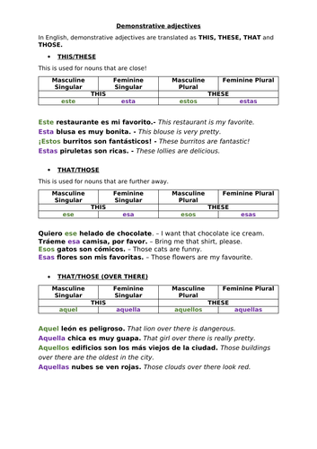 Demonstrative adjectives spanish worksheet. Demonstrative adjectives In Spanish, as in English, demonstrative adjectives are words that "demonstrate" or "point out" nouns. Demonstrative adjectives precede the nouns they modify and, like other Spanish adjectives you have studied, agree with them in gender and number. Observe these, then study the following chart. Includes links to worksheets in the video description. 5. Video - Possessive Adjectives- A video lesson that explains the short and long forms of possessive adjectives in Spanish. 6. Video - Demonstrative Adjectives and Pronouns - A complete 9-minute video lesson that covers the demonstrative adjectives. 7. Demonstrative Adjectives - Spanish Grammar Lessons Demonstrative Adjectives These are used to indicate a specific noun or nouns. They go before the noun they modify. este = this (for masculine nouns) esta = this (for feminine nouns) esto = this (when noun is not identified) estos = these (for masculine nouns) estas = these (for feminine nouns) Spanish Sentence Quiz: Demonstrative adjectives 1. The English version of a sentence will appear here. 0. questions answered. Correct Answers (click to close) 1. Quiero esa mantequilla. 2. Quiero esa televisión.