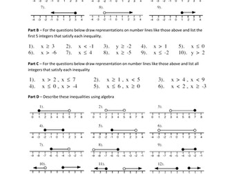 Number Line Inequalities Worksheet with Answer Sheet. free. 4.8. This is an inequalities worksheet with answer sheet. Students are given a brief help section before being asked to describe inequalities they see on a number line as well as draw inequalities. The worksheet is differentiated and ideal for either an in-class task or homework.