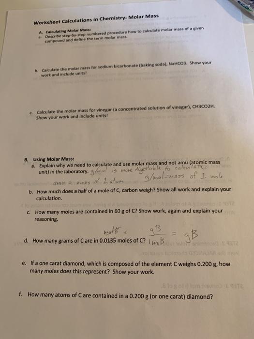 Molecular mass and mole calculations worksheet answers