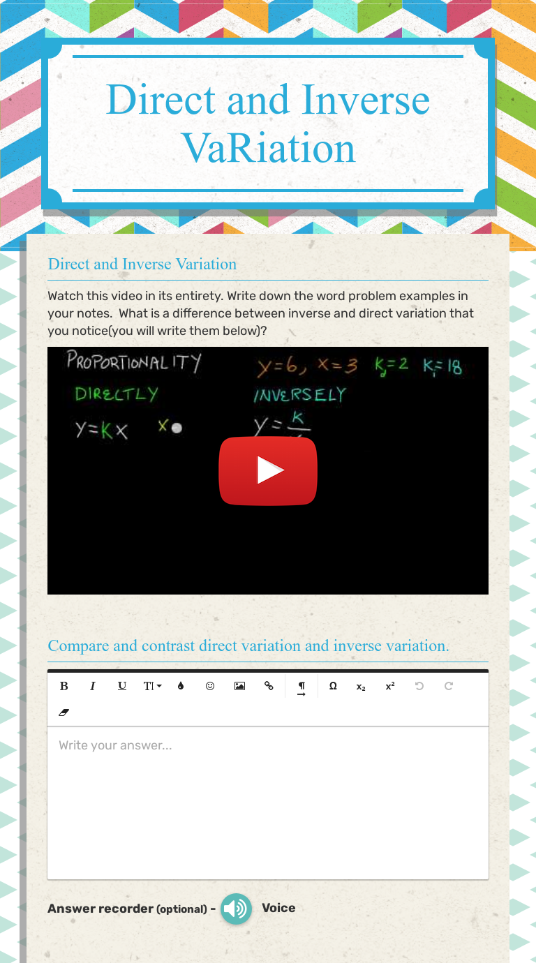 Worksheet on Direct Variation | Word Problems on Direct ... Dec 16, 2020 · Worksheet on Direct Variation includes different questions to practice. Learn how to solve Word Problems on Direct Variation by referring to the Solved Examples available. We have provided Step by Step Solutions for all the Problems explained in the Direct Variation Worksheet. Practice using them and learn different methods used to approach.