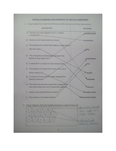 Metallic bonding worksheet with answers. Valence Electron: Definition, Configuration & Example ... 2021-09-23 · Valence electrons, located on an atom's outermost shell, affect how an atom will behave with other atoms. Learn more about a valence electron, including its … study.com › academy › practiceQuiz & Worksheet - Lewis Structures | Study.com Metallic Bonding: The Electron-Sea Model & Why Metals Are Good Electrical Conductors 4:19 Intramolecular Bonding and Identification of Organic and Inorganic Macromolecules 5:11 Quiz & Worksheet - Metallic Bonding | Study.com Metallic Bonding: The Electron-Sea Model & Why Metals Are Good Electrical Conductors. Worksheet. 1. What is the electron sea model? The model of metallic bonding where electrons float free in a ... Metallic Bonding Worksheets & Teaching Resources | TpT An activity worksheet summary of metallic bonding where students define, list characteristics and draw an image of how metallic bonding may appear, including alloys. They need to explain the properties of electrical conductivity and malleability using the definition of metallic bonding.