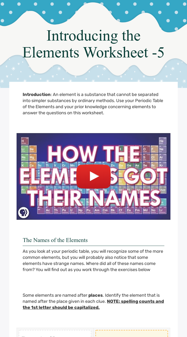 Fresh Introduction To The Periodic Table Worksheet - The ... Periodic Table Worksheet And Answers. Introduction to the Periodic Table worksheet. Click cover for full preview. Elements Compounds and Mixtures 2. Dont forget the f-block. Moseley _ arranged elements according to atomic number. Who Am I Periodic Table Worksheet Answers. Names and Symbols for Elements and Compounds 3.