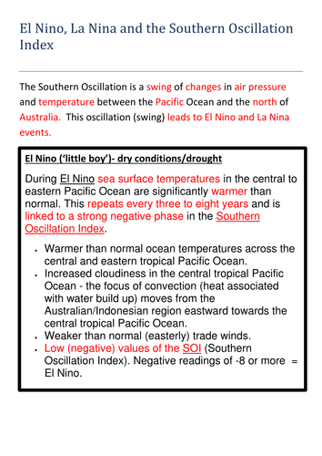 PDF El Niño / Southern Oscillation Concentrating on El Niño / Southern Oscillation (ENSO)." As previously noted, this discussion at a minimum needs to cover the first two sections. A worksheet, which is broken into four sections, is provided to help focus the discussion. Students can either complete the worksheet as time permits in class or as homework or some combination.