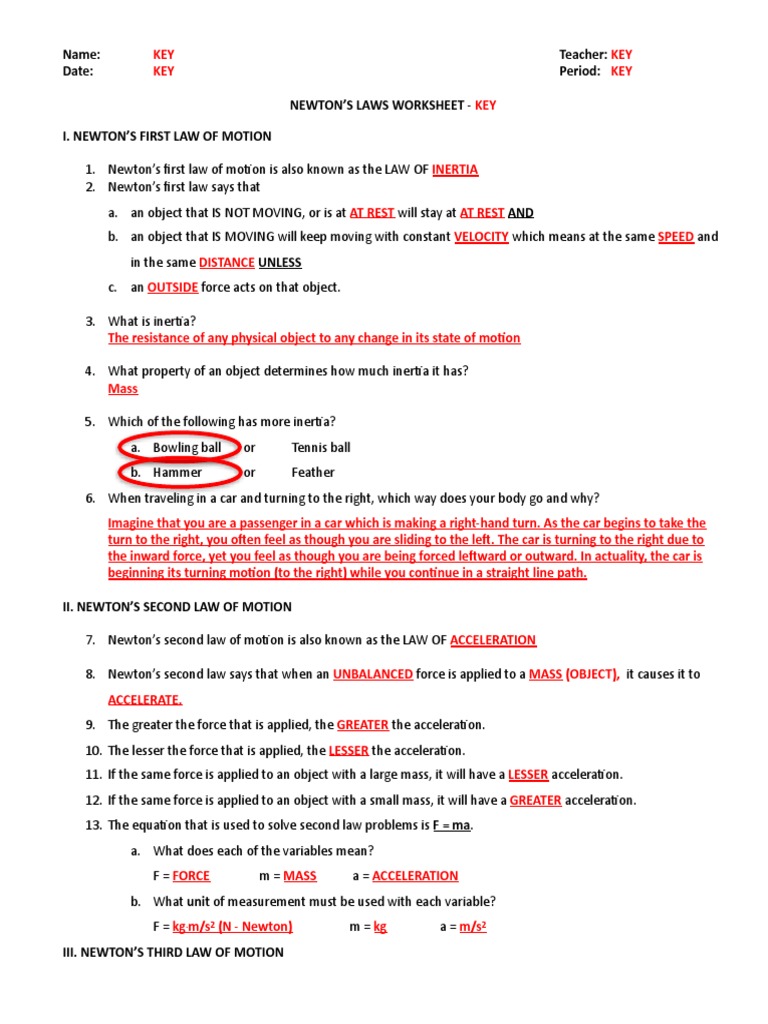 PDF review worksheet - key NEWTON'S LAWS WORKSHEET - KEY I. NEWTON'S FIRST LAW OF MOTION 1. Newton's first law of mo2on is also known as the LAW OF INERTIA 2. Newton's first law says that a. an object that IS NOT MOVING, or is at AT REST will stay at AT REST AND b. an object that IS MOVING will keep moving with constant VELOCITY which means at the same SPEED and