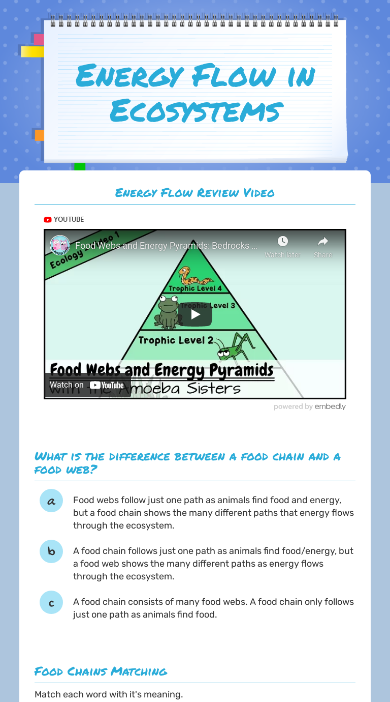 DOC 1.4.6 Energy Flow Worksheet - PDST Feeding allows _____ in an ecosystem. Energy flow in the ecosystem Food Chain. Is a flow diagram that begins with a _____ and shows how _____ is passed through a series of _____. Each organism feeds on the one before it.