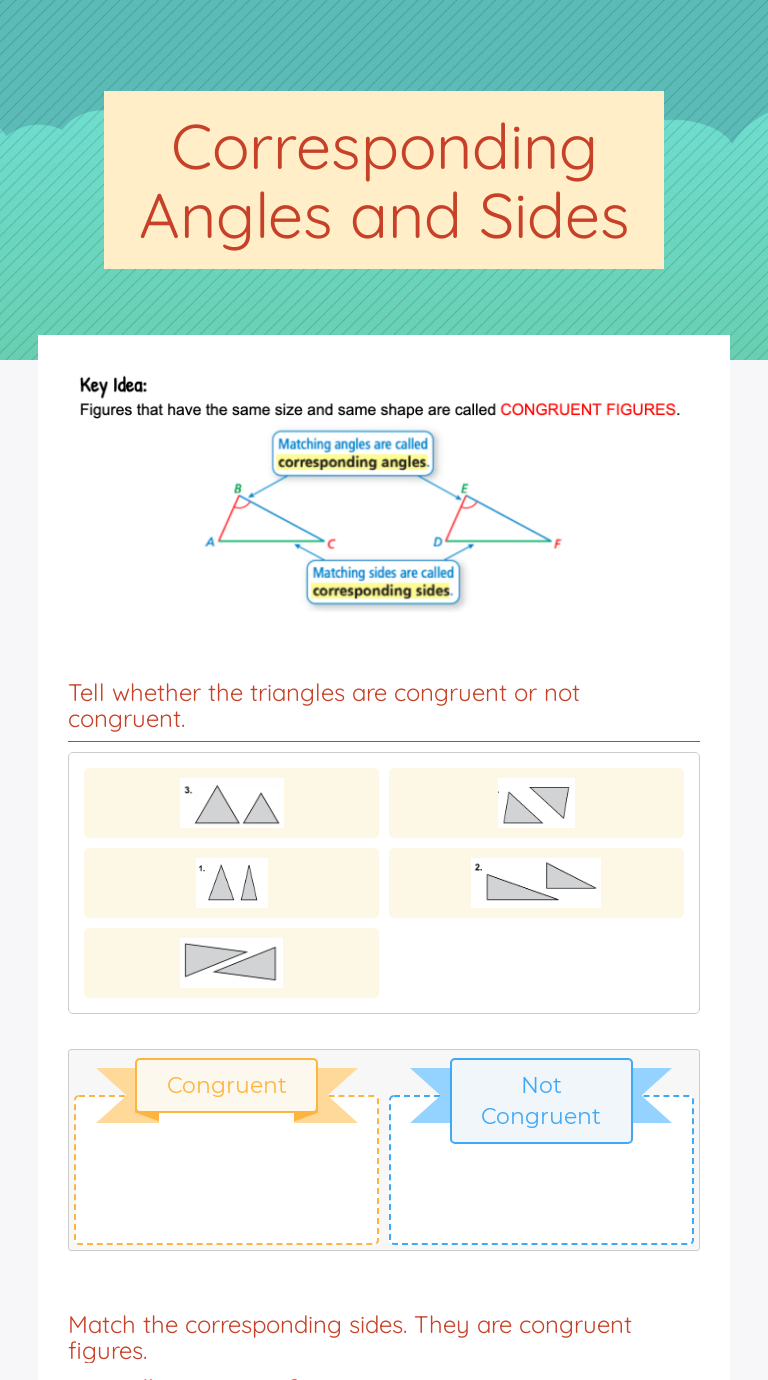 Corresponding Sides And Angles - Teacher Worksheets Some of the worksheets displayed are Corresponding angles work find the missing angles, Congruent triangles 1, Triangles angle measures length of sides and classifying, Corresponding sides and angles of similar triangles, Ms work 132 153 geometry 06, Lesson 4, Grade 6 math circles, Loudoun county public schools overview.
