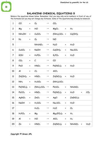 zipworksheet.com › balancing-equations-worksheetBalancing Equations Worksheet Answer Key Nov 12, 2021 · Balancing Equations Worksheet Answer Key. I’m a writer, not an accountant. The acknowledgment of double-entry accounting acclimated to put me to beddy-bye — and again accord me accent nightmares. Fortunately, I’ve evolved. I won’t pretend that I’ve adapted into a number-loving accounting superstar. But Excel accounting for baby business doesn’t crave you to be one either. All you ... templatelab.com › balancing-equations-worksheet49 Balancing Chemical Equations Worksheets [with Answers] Apr 02, 2020 · When you find difficulty in balancing the equation in the balancing chemical equations worksheet, you can miss it with a fraction of ½ and that will easily balance the equation. But the problem is that you cannot have a fraction for the co-efficient, this is why doubling all coefficients will help you balance the equation. Balancing Equations Worksheet 2 Answer Key - Thekidsworksheet Worksheet Balancing Equations Worksheet 2 Answer Key Worksheet Balancing Equations Worksheet 2 Answer Key January 28, 2022 3 c2h4o2 2 o2 2 co2 2 h2o. Answers to practice problems 1. This Worksheet Includes 2 Pages Of A Total Of 50 Chemical Equations For Balancing Both The Student S Copy And The Answe Chemical Equation Equations Worksheets 41 worksheet balancing equations answers - Worksheet Works Balancing equations worksheet 2 answer key. 2 6 agi fe2 co3 3 2 fei3 3 ag2co3. Cypress ranch high school. Balancing equation and answer key displaying top 8 worksheets found for this concept. 3 c2h4o2 2 o2 2 co2 2 h2o. This is a collection of printable worksheets to practice balancing equations. Balancing equations worksheet 1 answers author.