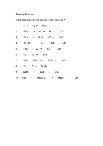 Balancing Equations Worksheet 1 Answer Key - Studying ... Writing and balancing equations worksheet balancing chemical equations answer key balance the equations below. 1 fe 2o 3 s 3 co g 2 fe l 3 co 2 g 7. 2 Al 3 CaOH 2 2 AlOH 3 3 Ca 3 3 2. This is a collection of printable worksheets to practice balancing equations.