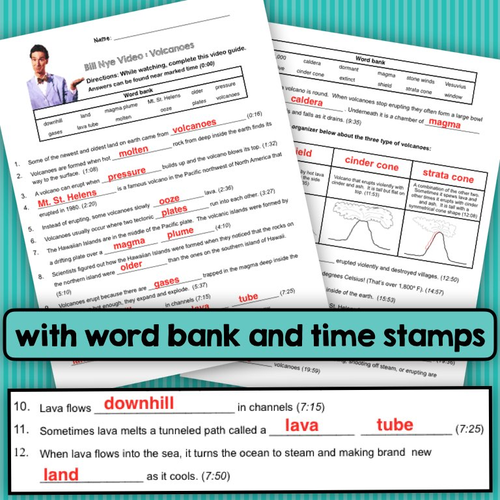 Bill Nye the Science Guy : VOLCANOES! (Earth Science ... This worksheet can be used to accompany the Bill Nye video VOLCANOES (Season 4, Episode 14). The worksheet has 19 questions that help students stay focused on various science facts about VOLCANOES (types, lava, magma chambers, tectonic plates, eruptions, etc...).