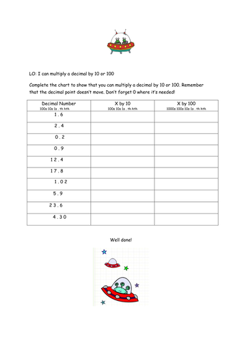Multiplying by 10, 100 and 1000 Worksheet (teacher made) Use this lovely worksheet to help your children practise multiplying by 10, 100 or 1000. A fantastic homework task or a morning work activity, these engaging sheets ask for children to match the eggs to the dragons by multiplying by 10, 100 or 1000. A great activity to consolidate this skill. You might also like this worksheet on multiplying and dividing by 10.