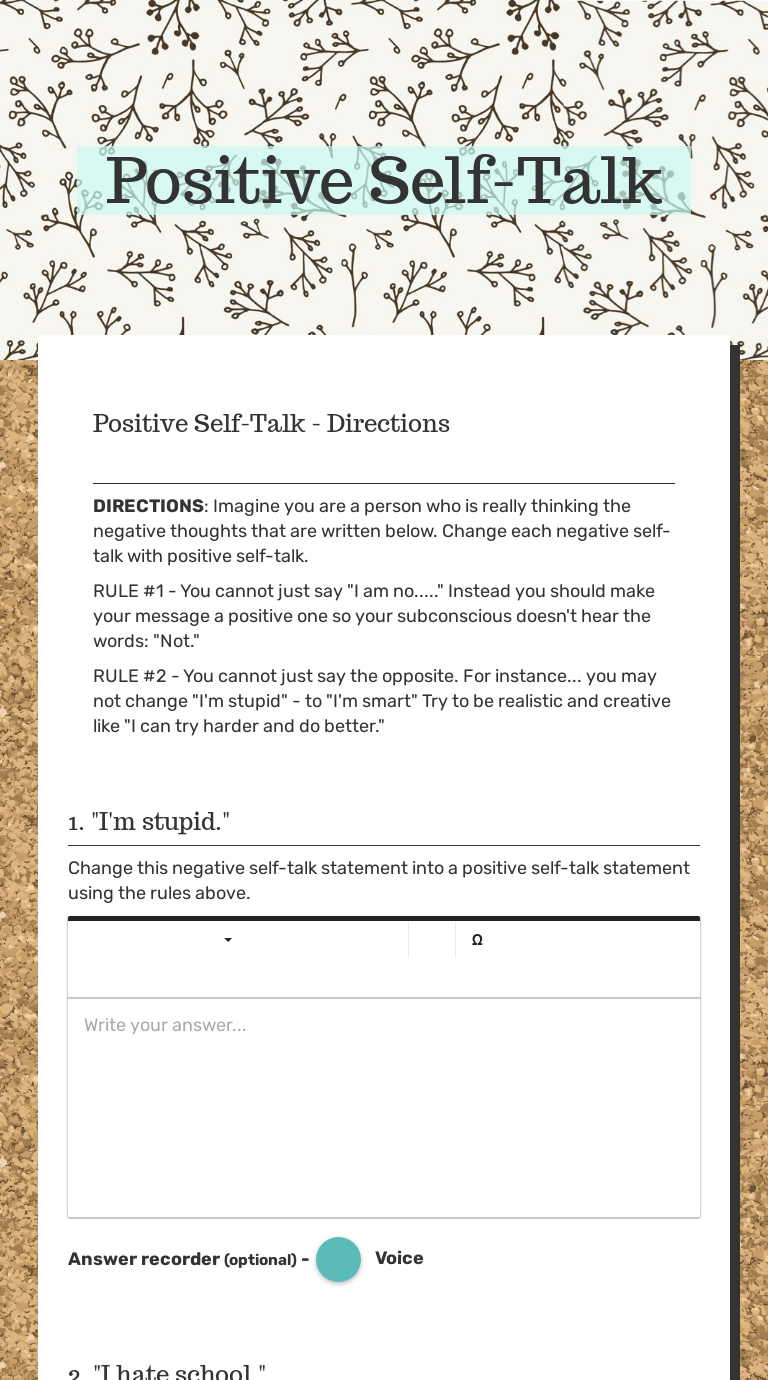 Positive self talk worksheet. › practicing-positive-selfPracticing Positive Self Talk Worksheet - Centervention® Practicing Positive Self Talk Worksheet Prep: . Prompt: “ . Today we’re going to practice using positive thinking skills. Who knows what self-talk means? Self-talk... Hand out worksheet: . On this positive self-talk worksheet, you’ll see a list of phrases on one side and on the other... Bonus ... [FREE PDF] How To Stop Self-Sabotaging Worksheet Learning how to stop self-sabotaging in this type of case has a lot to do with adjusting your negative self-talk. In addition to doing the self-sabotaging behaviors worksheets we recommend (see below), it’s also worth practicing daily affirmations. These will rewrite some of the limiting beliefs that lead to you regularly sabotaging success. pws.wwu.edu › Positive_Self_Talk_WorksheetPOSITIVE SELF-TALK - Western Washington University practicing positive self-talk is so important! Negative self-talk has a number of harmful effects, including lowered self-esteem, poor performance on tasks, and increased anxiety. On the other hand, positive self-talk is linked to increased self-esteem, mastery of tasks, and lowered anxiety (PositivePsychology.com). › Browse › SearchPositive Self Talk Worksheets | Teachers Pay Teachers 101. $12.00. PDF. Therapy worksheets include a combination of thought-provoking identity development, feelings and needs identification, goal setting, asking for help, and self-care planning questions that assist in fostering self-esteem and improving well-being.Each worksheet that may be used for individual, group c.