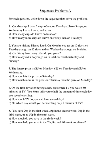 Arithmetic sequence word problems worksheet. WORKSHEET: Arithmetic Sequence & Series ... - StudyLib WORKSHEET: Arithmetic Sequence & Series Word Problems ... ARITHMETIC SEQUENCES & SERIES WORKSHEET The general term of an arithmetic sequence is given by ... Arithmetic Sequence Word Problems Worksheet With Answers ... Arithmetic Sequences Maze Arithmetic Sequences Word Problem Worksheets Sequencing Worksheets. Algebra 2 Worksheets Dynamically Created Algebra 2 Worksheets Arithmetic Sequences Geometric Sequences Algebra 2 Worksheets. Arithmetic And Geometric Sequences Coloring Activity Two Versions Geometric Sequences Arithmetic Color Activities. Sequence Word Problems worksheet - Liveworksheets.com ID: 1359649 Language: English School subject: Mathematic Grade/level: 10 Age: 11-14 Main content: Solving Sequence Other contents: Arithmetic & Geometric sequence Add to my workbooks (1) Download file pdf Embed in my website or blog Add to Google Classroom Arithmetic Sequence Word Problems Worksheets & Teaching ... 4. $2.99. PDF. This activity contains 12 arithmetic sequence word problems. Students will need to use the arithmetic sequence term formula and sum formula to solve the problems. A few of the problems require students do to a system of equations to solve. How the Activity Works: Each page is printed and put u.