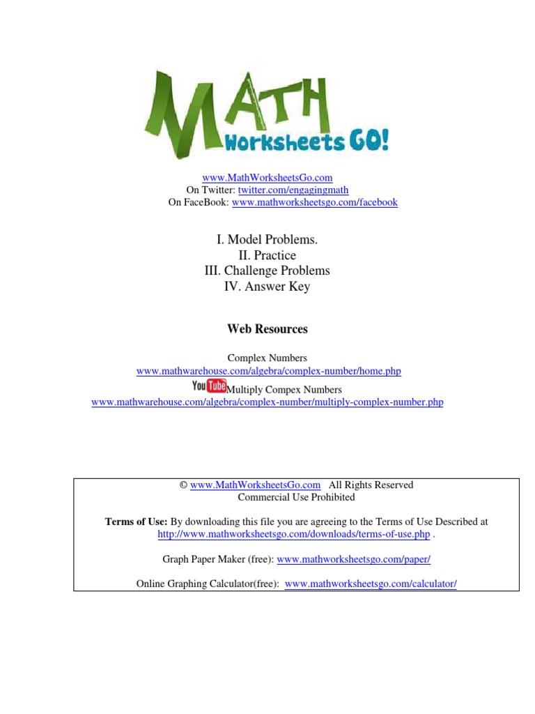 Complex Numbers Worksheets with Answer Keys. Free pdfs to ... Each worksheet has model problems worked out step by step, practice problems, as well as challenge questions at the sheets end. Plus each one comes with an answer key. Simplify Imaginary Numbers. Adding and Subtracting Complex Numbers. Multiplying Complex Numbers. Dividing Complex Numbers. Dividing Complex Number (advanced)