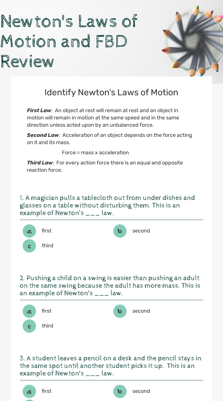 Newton's First Law Of Motion Worksheet Answers Newton's first law of motion worksheet answers.Newton s laws worksheet key i. About this quiz worksheet. Examining what it takes to get an object to stop this quiz and corresponding worksheet will help you gauge your knowledge of the properties of newton s first law of.