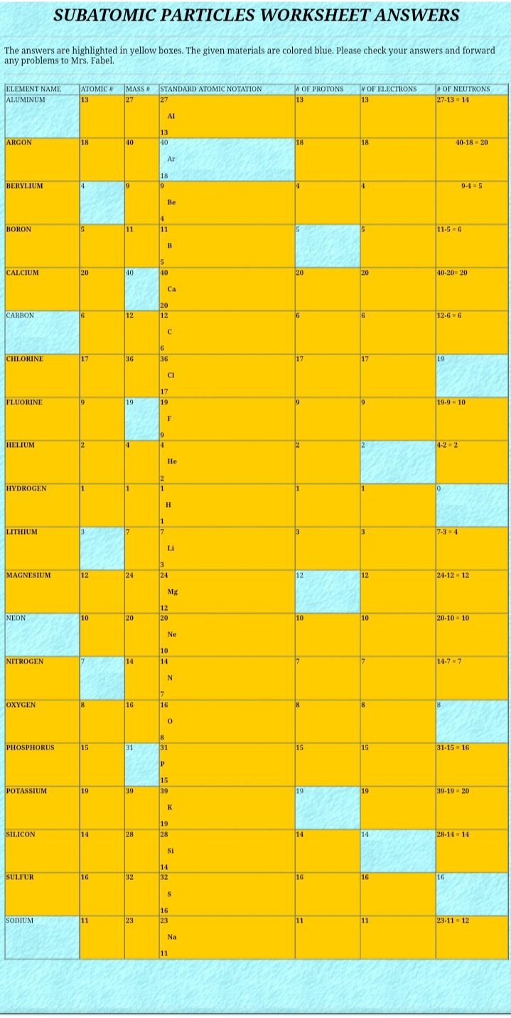PDF Microsoft Word - subatomic particles e-board answers.doc SUBATOMIC PARTICLES and ISOTOPES WORKSHEET. Complete the following table using the information discussed in class and your Periodic Table. Answer each of the following using your knowledge of chemistry and the Periodic Table. 4) An atom contains 55 protons. What is the element... subatomic particles worksheet answers Subatomic particles worksheet answers. The answers are highlighted in yellow boxes. The given materials are colored blue. Please check your answers and forward any problems to Mrs. Fabel. Subatomic Particles Worksheets - Teacher Worksheets Subatomic Particles Worksheets - there are 8 printable worksheets for this topic. Worksheets are Subatomic particles work answers, Subatomic particle ... Elementary Particles - Subatomic Particles - List, Mass, Charge Elementary particles or subatomic particles list, types, discovery and experiment, charge, mass and properties of particle like electron, proton and Fundamental particles like proton and neutron located on the positive charge nucleus, electron are the extranuclear subatomic part of an atom carries the...