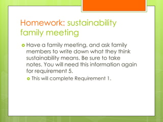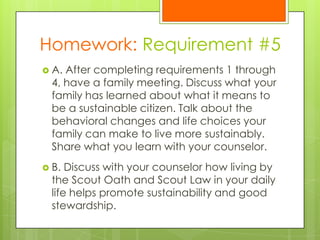 Sustainability Merit Badge - Scoutmaster Bucky Before starting work on any other requirements for this merit badge, write in your own words the meaning of sustainability. Explain how you think conservation and stewardship of our natural resources relate to sustainability. Have a family meeting, and ask family members to write down what they think sustainability means. Be sure to take notes.
