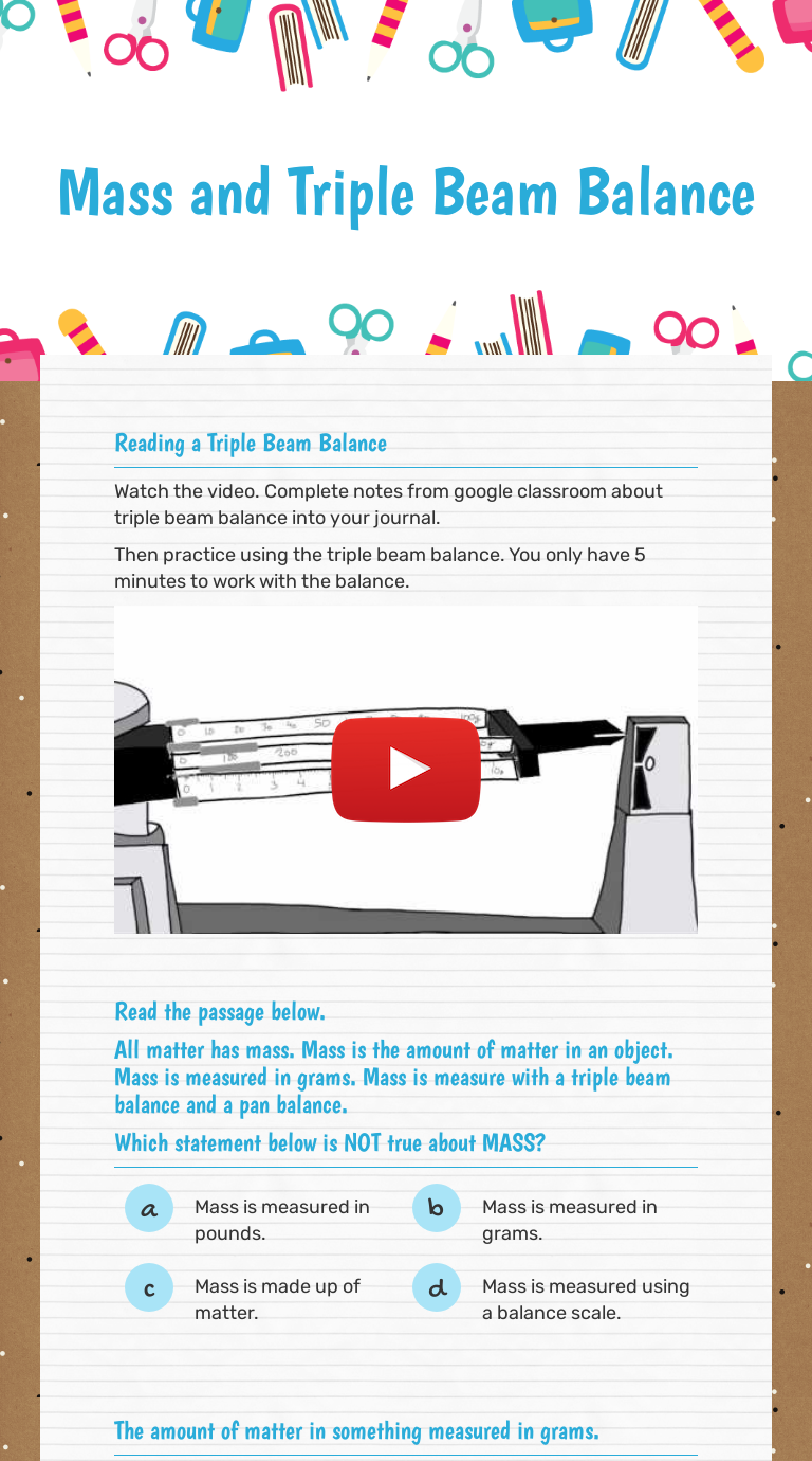 Using a Balance Scale Scales are tools used for measuring weight. Balance scales are commonly used to compare the weights of objects or to weigh objects by balancing them with standard weights. By using the resources below, students will learn about this important science tool and practice using it in...