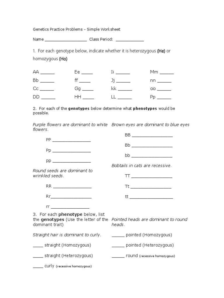 Bio 10-Dr. Cunningham Genetics Worksheet - Variations Genetics Practice Problems - Simple Worksheet. AA_Ho. Bb He cc_ He. DD_Ho. 1. For each genotype below, indicate whether it is heterozygous (He) or.6 pages