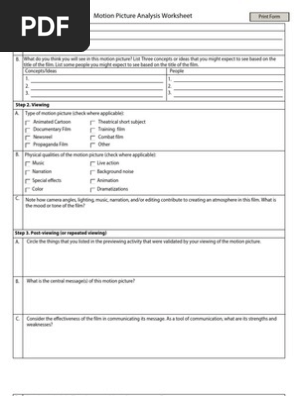 PDF Analyzing Presidential Campaign Commercials using the motion picture analysis tool worksheets provided. 2.) Analyze two of the four cartoons shown on the main screen during class using the cartoon analysis tool worksheets provided. 3.) Write a one page summary (in your notebook) on your conclusions and interpretation of the propaganda. -Your summary should include what you observed ... Motion Picture Analysis Worksheet - edteck.com Motion Picture Analysis Worksheet. Step 1: Pre-viewing. A. Title of film: _____ Record Group source: _____ B. What do you think you will see in this motion picture? List Three concepts or ideas that you might expect to see based on the title of the film. List some people you might expect to see based on the title of the film. Concepts/Ideas ...