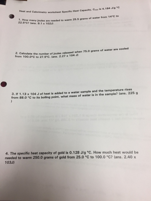 Calorimetry Practice Worksheet Answers - 1 - - Gallery Briner Calorimetry Practice Worksheet Answers - 1 - It shows you how to calculate the quantity of . Temperature of water increases from 20.00 oc to 22.50 oc. A 2.50 g sample of zinc is heated, then placed in a calorimeter containing 65.0 g of water. What is the specific heat of aluminum if the temperature of a 28.4 g sample of aluminum is increased by.