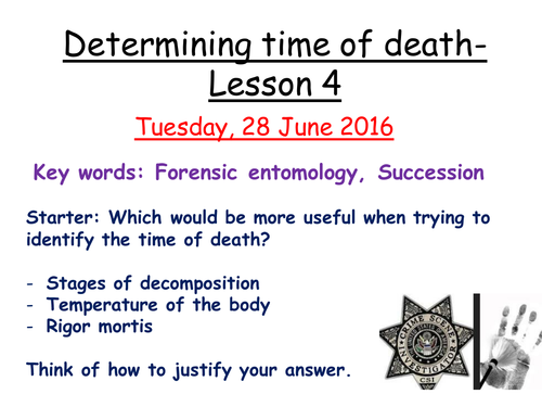Forensic Entomology Teaching Resources | Teachers Pay Teachers Forensic Entomology Worksheet | Calculating Time of Death With Insects by MK Science Lab 6 $3.00 Zip This Forensic Science lesson over FORENSIC ENTOMOLOGY allows students to understand how time of death can be estimated the life cycles of commonly found flies and beetles.