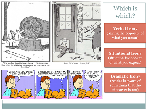 Irony Lesson Plan - Video & Lesson Transcript | Study.com Irony is a type of literary device that uses contradiction and opposite meaning to make a point or convey humor. Explore a lesson plan for teaching students about irony, including materials,... PDF Irony. There are 3 kinds of irony: •Verbal •Situational •Dramatic Verbal Irony. Verbal irony occurs when a character says one thing but means the opposite. Verbal irony is also called sarcasm or beingsarcastic. Verbal Irony. Examples. Middle school students smell especially good on days when they have conditioning. Awesome!