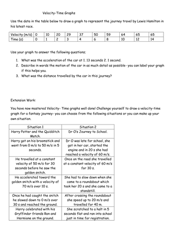 Velocity Time Graph Worksheets Teaching Resources | TpT 5. $1.29. Word Document File. This is a worksheet to create a position-time graph for five or 6 students completing 40 m. All data produces straight graphs. It gives students practice calculating average velocity, 0 to 10 m, 0 to 20 m, 0 to 30 m etc, There is also one example of a person standing at the 20 m mark to produce a horizontal line.