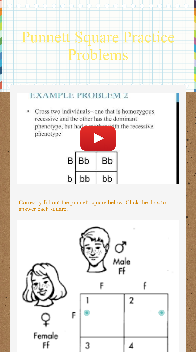 Punnett square practice problems worksheet answers. Punnett Square Practice 1 Worksheets - K12 Workbook Punnett Square Practice 1. Displaying all worksheets related to - Punnett Square Practice 1. Worksheets are Punnett square work, More punnett square practice 11, Dihybrid punnett square practice, Aa ee ii mm bb ff jj nn cc gg kk oo dd hh ll pp, Bikini bottom genetics name, Punnett squares answer key, Genetics work, Chapter 10 dihybrid cross work. punnett square worksheet 2 answer key punnett square worksheet traits genetics practice squares answers answer inheritance mendel key worksheets using problems heredity recessive dominant variation hybrid. Stoichiometry practice worksheet answers. Punnett square practice worksheets with answer keys by the science lady. Punnett square practice answer worksheets keys teacherspayteachers PDF Practice with Punnett Squares - University of Utah Circle the best answers: a. It takes two y alleles to cause the green phenotype. y is ( dominant / recessive ) b. It takes one Y allele to cause the yellow phenotype. Y is ( dominant / recessive ) 4. In dogs, furnishings is a dominant trait. What's another example from Mutt Mixer of a dominant trait? C. Co-dominant inheritance DOC Punnett Square Practice Worksheet - Boyd County Public Schools Punnett Square Practice WS Answer these questions & illustrate scenarios in your own notebook. 1) For each of the genotypes (AA, Aa or aa) below determine what the phenotype would be. Purple flowers are dominant to white flowers. PP_____________ Pp____________ pp_______________ Hairy knuckles are dominant to non-hairy knuckles in humans.