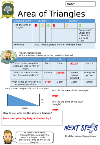 Area of a triangle worksheet | Teaching Resources pdf, 654.99 KB Great for homework. Catch up following Coronavirus. Worksheet on finding the area of a triangle. Starts with simple examples and gets progressively harder. Plus Answers included + links to worked examples if students need a little help. School closures and replacement online classes have made a generation of students fall behind.