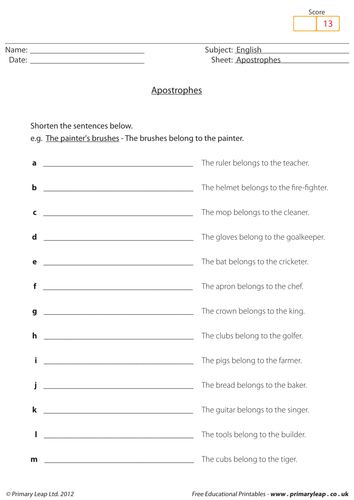 Apostrophe worksheet middle school. PDF English language worksheet II APOSTROPHES - Cardiff Metropolitan University Exercise 2.1 - possessive apostrophes Each sentence has no possessive apostrophes. Put them in. Some italic hints are given 1. The Head Teachers study is over there. One head teacher. 2. The geography teachers staffroom is on the left. Lots of geography teachers 3. Jack Davies class was the best in the school. 4. Apostrophe Worksheets Teaching Resources | Teachers Pay Teachers Apostrophe Practice Worksheets by Middle School Mood Swings 32 $1.50 PDF Activity I created these worksheets because many of my students struggle with correct apostrophe use. They are great practice for them and can be used as a mini lesson, homework, or sub plans. I hope you and your students enjoy them! Subjects: English Language Arts, Grammar Contraction Worksheets - Teaching Contractions Phonics Worksheets. Download and print phonics worksheets that help students learn about consonant sounds, long and short vowel sounds, vowel digraphs, diphthongs, and consonant blends. Grammar Worksheets. Practice parts of speech. Reading Worksheets. Literature circle worksheets, graphic organizers, book review forms, and story maps. Grammar Resources for Grades 6-8 - TeacherVision Review the rules of grammar with your sixth-, seventh-, and eighth-grade students, with these printable worksheets and lessons. From identifying parts of speech to using superlatives to understanding spelling rules, these printables will help your students memorize the important grammar guidelines that they will use throughout middle and high school.