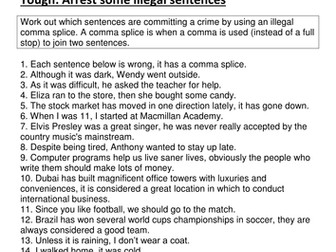 PDF Comma splice worksheet with answer key examples pdf printable Splice Links If you would like the answers to all the worksheets (total of 20 different topics), along with tips on teaching (or learning) every topic, get the answers (with teaching tips) to every worksheet, a total of 208 pages of grammar, usage, and writing style exercises, with answers and tips for teaching for 7.00. Avoiding Comma Splices: Punctuation Worksheet File previews. docx, 19.01 KB. This resource contains some interesting texts with punctuation errors, involving comma splices (the use of a comma where a full stop is more appropriate), for students to correct. Useful as a lesson starter or homework activity. PDF Lesson.Fused.Sentences - Grammar Worksheets Definition: A comma splice is a comma that joins (splices) two independent clauses. A clause is a group of words that has a subject and a verb. A fused sentence ( ), on the other hand, occurs when two independent clauses (complete ideas) are joined without any punctuation. It is better to avoid the term run-on sentence altogether and use only the terms comma splice and fused sentence.