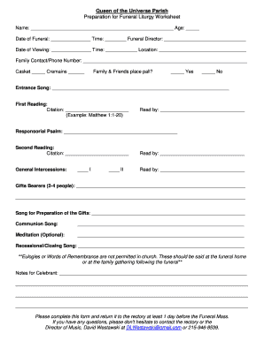 PDF Funeral Planning Packet - St. John's Episcopal Church Funeral Planning Packet ST. JOHN'S EPISCOPAL CHURCH I 3857 NORTH KOSTNER AVENUE I CHICAGO, ILLINOIS 60641 I 773.725.9026 I Funeral Planning Name Date St. John's Episcopal Church We are gathered to celebrate God's gifts and sent to respond to the needs of the world. ST. PDF Funeral Planning Guide and Worksheet Funeral Planning Guide and Worksheet " T h e l i t u r g y f o r t h e d e a d i s a n E a s t e r l i t u r g y . I t f i n d s a l l i t s m e a n i n g PDF Funeral Planning Guide this funeral planning guide provides an easy-to-use format for documenting information your loved ones will need after your death: • he t"my personal information"section allows you to record details your family will need for official records but that, in their grief, they may not be able to recall. • he t"my funeral plans"section makes it … 11+ Funeral Planner Templates in PDF | Word | PSD A funeral planning guide and worksheet is commonly made by organizations who are in-charge of providing funeral services and other funeral requirement-related items. These plan templates are very helpful in terms of plotting out all activities that can allow an organized funeral program to materialize. 5. Planning for Catholic Funeral