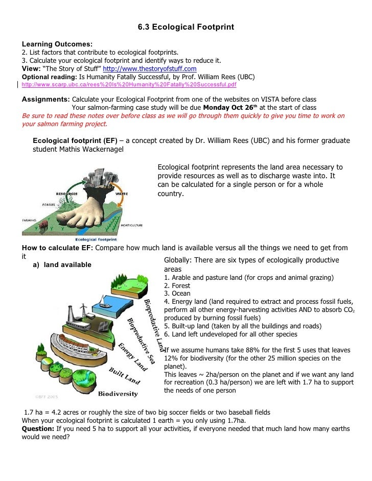 PDF Ecological Footprints From Around the World w template - SCIC Students then complete the worksheet (BLM 5.2) individually. Each student will need to use a computer and the ... that a country with more highways will have more people driving or driving long distances in personal vehicles, ... Ecological Footprint calculators include human activities such as housing, food, Ecological Footprint Calculator Teaching Resources | TpT Let your students calculate their ecological footprints and see their own impact with this free resource. Engage your students with this worksheet is designed to accompany the Global Footprint Network website footprint calculator. Perfect for the start of the school year or a unit on ecology.How many Earths do we need if everyone lived like you? PDF Ecological Footprint Assignment - Weebly personal footprint. Answer the quiz questions honestly—you are not being marked on the size of your footprint! Record your answers to the quiz questions. This is for reference only, so that you can complete the assignment later. 1. Record your footprint in the following table. Complete the pie chart to represent your footprint. Category ... Ecological Footprint Worksheet-With Answers - Course Hero Section 1: Sustainability and Ecological Footprint Figure 1 is a graph of ecological footprint measured as the number of planets versus time. As is shown, we have just one planet, so the earth's bio-capacity in number of planets is 1 (horizontalblue line).