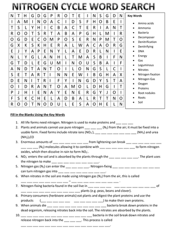 The Nitrogen Cycle - Worksheet | Printable and Distance Learning This worksheet is the perfect way for helping your students learn and review The Nitrogen Cycle. In this worksheet, students will answer questions about the following terms: - The Nitrogen Cycle - Nitrogen - Soil nitrates - Soil ammonium - Waste and remains - Ammonification - Fertilizers - Nitrogen fixation - Denitrification