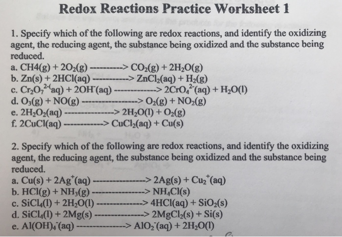 Oxidation-Reduction Worksheet - DocsLib Oxidation-Reduction Worksheet For each reaction below, identify the atom oxidized, the atom reduced, the oxidizing agent, the reducing agent, the oxidation half reaction, the reduction half reaction. 1.Mg + HCl à MgCl2 + H2 2.Fe + V2O3 à Fe2O3 + VO 3.KMnO4 + KNO2 + H2SO4 à MnSO4 + H2O + KNO3 + K2SO4 Redox Equations Worksheet - Equations Worksheets Free Download Redox Equations Worksheet These worksheets can be utilized by students in the 5th-8th grades. These two-step word problem are created using fractions and decimals. Each worksheet contains ten problems. These worksheets can be found both online and in printed.