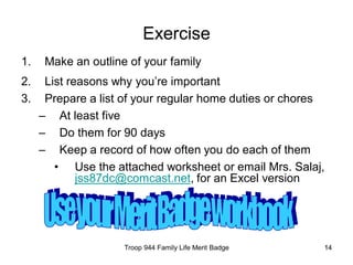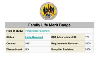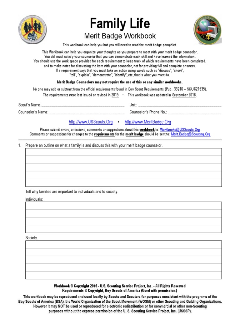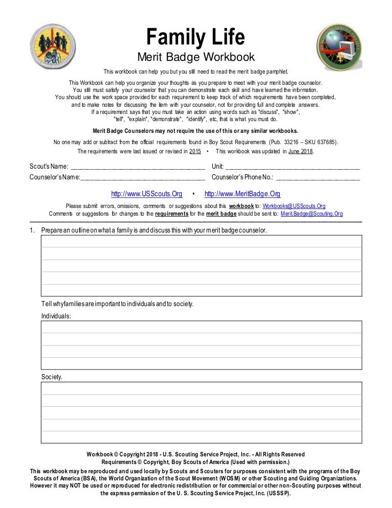 Family Life Merit Badge - scoutmasterbucky.com Family Life Merit Badge. Note to the Counselor Some of the issues surrounding requirement 6 for the family meeting could be considered of a personal nature. Use discretion when reviewing this requirement with the Scout. 1. Prepare an outline on what a family is and discuss this with your merit badge counselor.