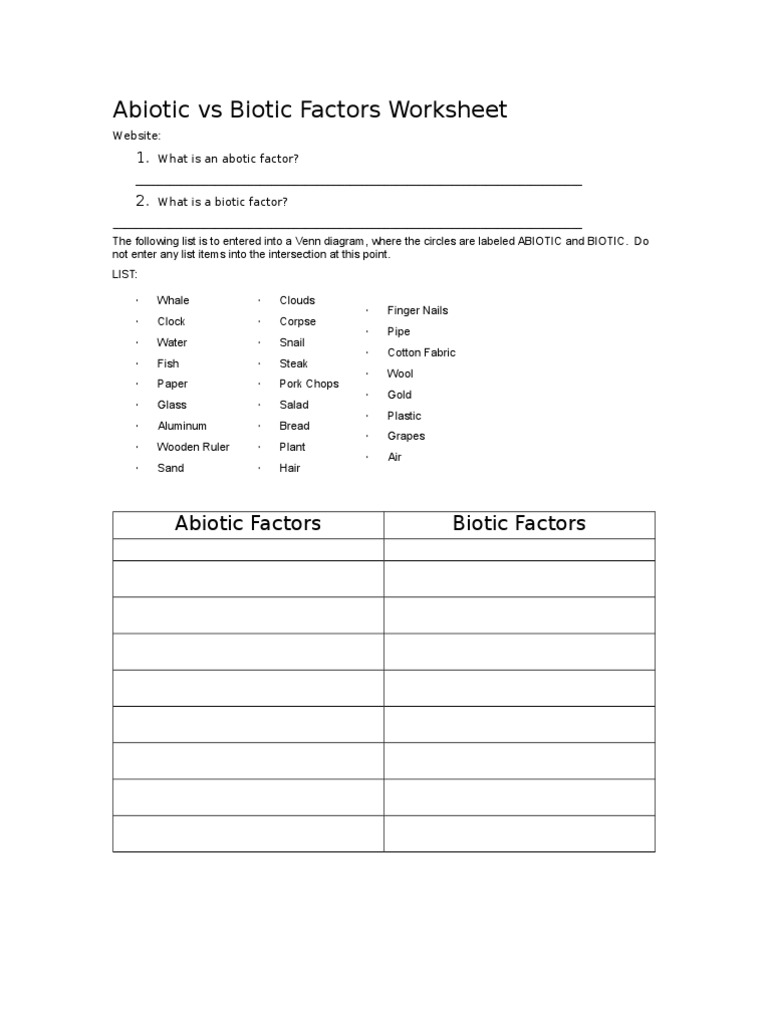 DOC Worksheet 1: Abiotic versus Biotic factors - Upper Merion Area School ... Abiotic vs. Biotic Factors Worksheet. What is an abiotic factor? _____ What is a biotic factor? _____ The following list is to be entered into a Venn diagram, where the circles are labeled ABIOTIC and BIOTIC. Do not enter any list items into the intersection at this point. LIST: Whale . Clock . Water . Fish . Paper . Glass . Aluminum . Wooden ...