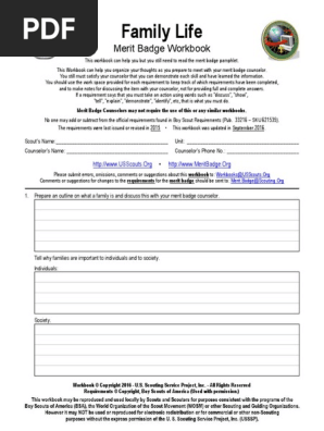 PDF Merit Badge Workbook - USSCOUTS.ORG No one can add or subtract from the Boy Scout Requirements #33215. Merit Badge Workbooks and much more are below: Online Resources. Worksheet developer: craig@craiglincoln.com. Requirements revised: 2005, Workbook updated: August 2008. ... Family Life p. 2 Merit Badge Workbook Scout's Name: _____ ...