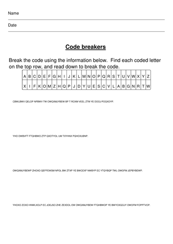 Break the code worksheet. How to Combine Multiple Excel Sheets into One Using Macro ... - ExcelDemy Open the new workbook and the worksheet where you want to merge these files. Here I've opened a new worksheet called "Combined Sheet (Horizontally)". Then we have to enter the VBA code to develop the Macro. We'll break the code step-by-step for better understanding and learning. ⧪ Step 1: Entering the Source Files and the Destination File Cracking Codes and Cryptograms For Dummies Cheat Sheet Double letters and apostrophes are also helpful when cracking ciphers. Easy Letter Cipher 1. Crack this cipher to reveal an interesting observation by J. Edgar Hoover, the first Director of the FBI. XURXE-XSIINBZ, N EOCS PKRBQ, NF XES ASG XK USFDKBFNMIS JNXNYSBFEND. How to separate names in Excel: split first and last name into ... Head to the Data tab > Data Tools group and click Text to Columns. On the first step of the Convert Text to Columns Wizard, select the Delimited option and click Next. On the next step, select one or more delimiters and click Next . In our case, different parts of names are separated with spaces, so we choose this delimiter. How to Create and Find Sheet Name Code in Excel (The ... - WPS Office 1.A sheet name is a way to identify the worksheet in Microsoft Excel. It's a unique identifier that helps you find a specific sheet in the workbook and create new worksheets from it. 2. To create a sheet name, open any worksheet in Microsoft Excel, then choose File > Save As from the menu bar. The Save As dialog box will appear. 3.
