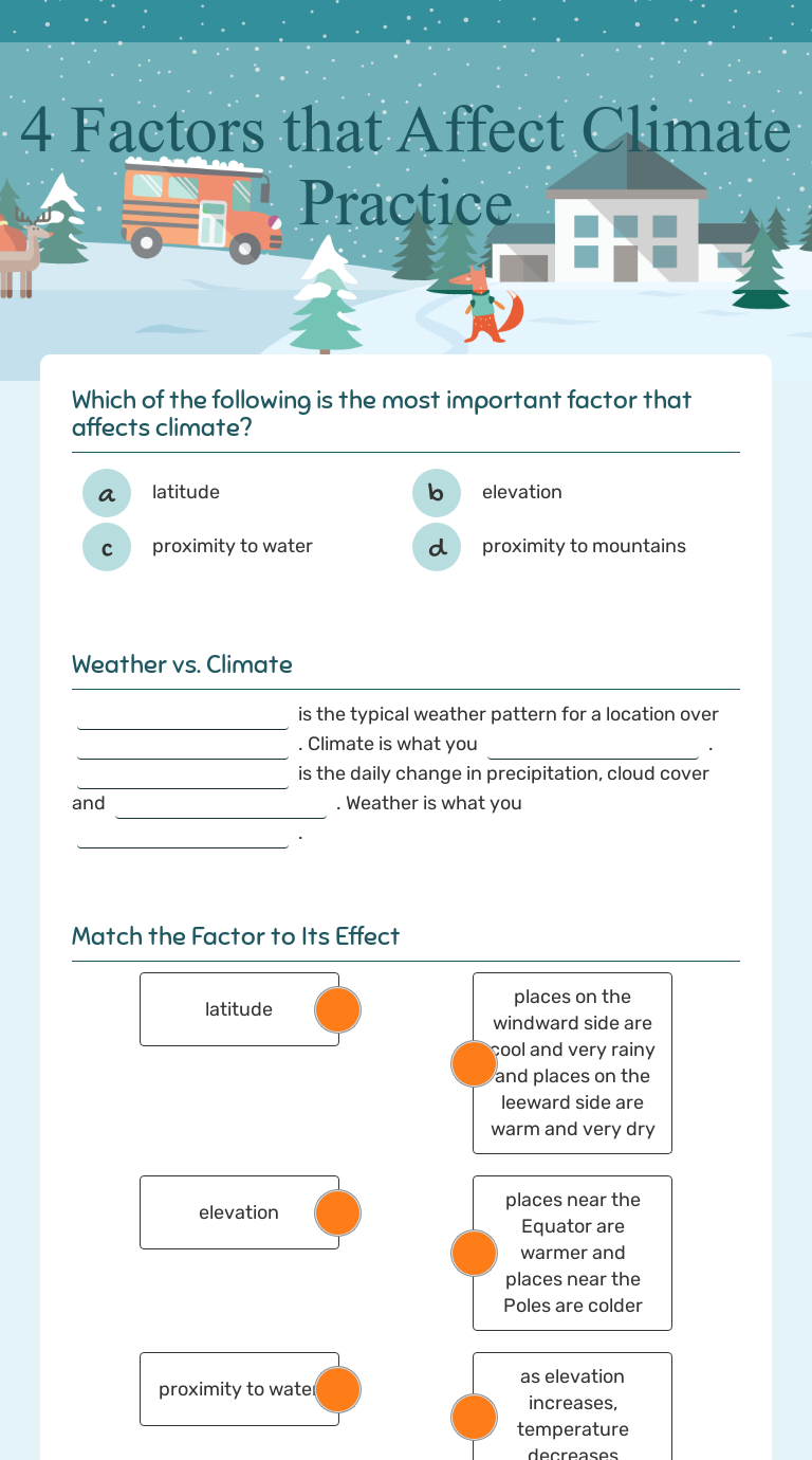 Factors that affect climate worksheet. Investment Research Library | Morningstar Oct 10, 2022 · Morningstar’s independent research is only biased in favor of investors. Dig into expert analysis from 100+ global researchers on securities, funds, markets, and portfolios. With transparent ... Factors that Influence Climate | Climate & Weather There are lots of factors that influence our climate Elevation or Altitude effect climate Normally, climatic conditions become colder as altitude increases. “Life zones” on a high mountain reflect the changes, plants at the base are the same as those in surrounding countryside, but no trees at all can grow above the timberline. Causes of mental disorders - Wikipedia Mental illnesses have risk factors, for instance including unequal parental treatment, adverse life events and drug use in depression, migration and discrimination, childhood trauma, loss or separation in families, and cannabis use in schizophrenia and psychosis, and parenting factors, child abuse, family history (e.g. of anxiety), and ... Science Content Standards - The National Academies Press People continue inventing new ways of doing things, solving problems, and getting work done. New ideas and inventions often affect other people; sometimes the effects are good and sometimes they are bad. It is helpful to try to determine in advance how ideas and inventions will affect other people.