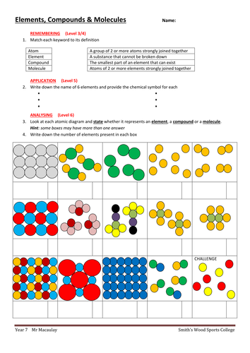 Atoms elements and compounds worksheet answers. How to Write a Chemical Equation (with Pictures) - wikiHow 30.04.2021 · Memorize the prefixes for number of atoms. In naming compounds, Greek prefixes are used to indicate the number of atoms present for each element. Covalent compounds are written out as molecular formulas due to the fact that each compound is a distinct, separate molecule. Covalent compounds have the first element written out completely while the second … Lab Safety Worksheets - Easy Teacher Worksheets These free worksheets help students learn proper lab safety techniques, laboratory equipment, and their proper usage. Do you know what happens in a science laboratory? What skills are needed to work in a lab? Chemistry and More - Practice Problems with Answers Dec 08, 2020 · Practice Problems: Writing and classifying equations; Answers. From the Chem Team: Worksheet of mass mole conversions Answers to Worksheet of mass mole conversions . Reactions in Aqueous Solutions. Study Questions; Answers. More Study Questions; Answers. Practice Problems: Determining whether a precipitate forms; Answers . Atomic Structure and ... Chapter 6 – Quantities in Chemical Reactions – Chemistry Answers. 127 g. 1.236 mol. 23.9 g. 0.251 g. 1.61 × 10 8 g (Back to the Top) 6.7 Chapter Summary. To ensure that you understand the material in this chapter, you should review the meanings of the following bold terms in the following summary and ask yourself how they relate to the topics in the chapter. Chemical reactions relate quantities of reactants and products. Chemists use the …