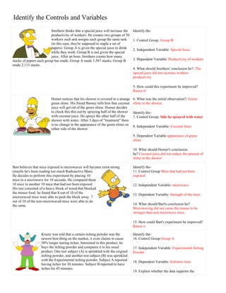 Identifying Variables Worksheet & Answers | Teaching Resources This worksheet focuses on core science skills required for identifying the independent, dependent, and controlled variables in science reports and experiments. The lesson includes a teacher-guided component and two activity worksheets for students to practice their skills along with a sample answer set for teachers to print, teach and go! Bart Simpson Controls And Variables With Answers - SlideShare 1. Identify the Controls and Variables Smithers thinks that a special juice will increase the Identify the: productivity of workers. He creates two groups of 50 workers each and assigns each group the same task 1. Control Group: Group B (in this case, they're supposed to staple a set of papers). Group A is given the special juice to drink 2.