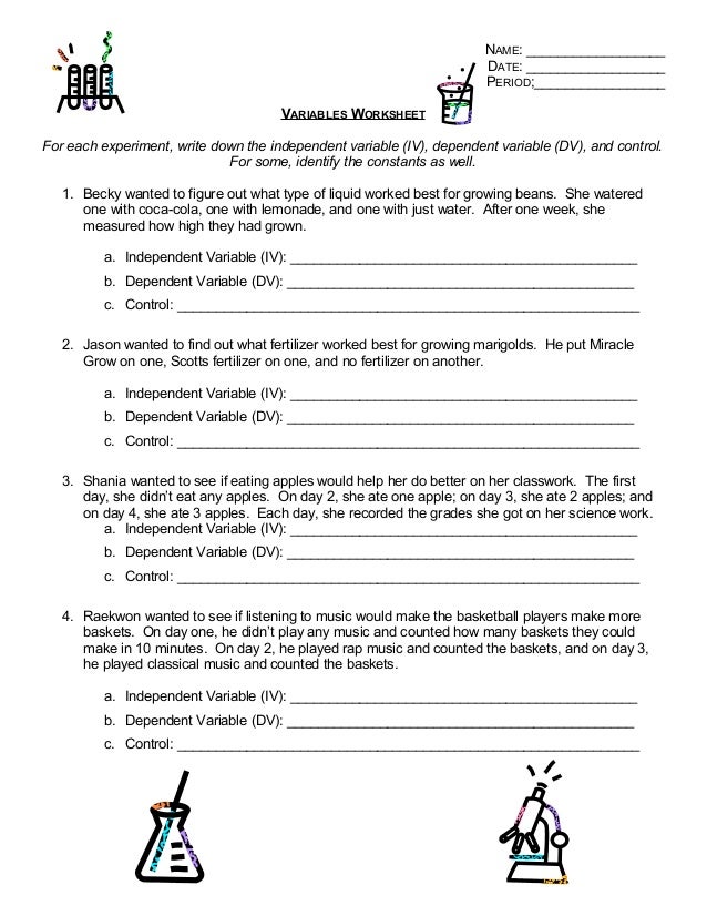 Identifying Variables Worksheet - Ms McRae's Science Identifying Variables Worksheet. Instructions: Read the question, hypothesis and experiment. Identify the variables for each example. Experiment #1.