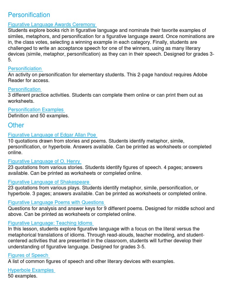 › figurative-languageFigurative Language Poems with Questions | Ereading Worksheets Aug 12, 2014 · This poem by Annie Matheson describes the beauty of nature as night descends over a summer day. It is packed full of figurative language! Metaphors, similes, some beautiful imagery, and at least five examples of personification. This is a great poem to study if you're teaching personification. Suggested reading level for this text: Grade 9-13